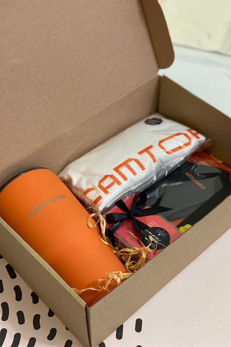 Kit de regalo personalizado en caja prediseñada kraft, cierre tradicional con suaje. Incluye biruta, tag y moño con listón. Contiene tres artículos promocionales desarrollados especialmente para este kit.
