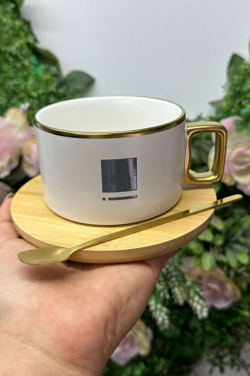Taza cerámica de color blanco con plato y cuchara personalizada en serigrafía capacidad 250 ml